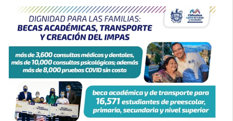 un trabajo coordinado, integral y sistémico, ofreciendo resultados a las y los chihuahuenses, en un corto plazo hemos ofrecido más de 3 mil 600 consultas médicas y dentales, también brindamos más de 10 mil atenciones psicológicas, más de 8 mil pruebas COVID gratuitas; entregamos medicinas sin costo a través del Banco de Medicamentos y reformamos los programas de salud para hacerle frente a la garrapata, de esta manera promovemos el desarrollo de las familias de Chihuahua Capital.