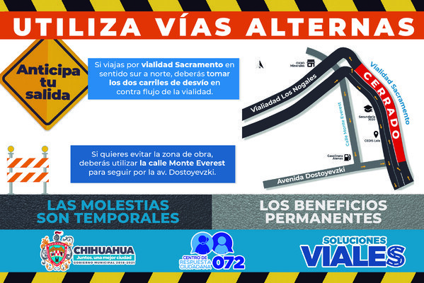 El próximo lunes 22 de marzo iniciarán los trabajos de rehabilitación en un tramo de 100 metros de la vialidad Sacramento; desde la avenida Dostoyevzki a la avenida Los Nogales, provocando el desvío vehicular en los carriles de sur a norte, por lo cual el Gobierno Municipal a través de la Dirección de Obras Públicas, exhorta a la ciudadanía a tomar las debidas precauciones al pasar por la zona de obra.