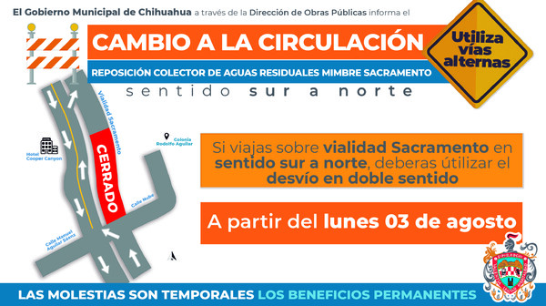 El Gobierno Municipal a través de la Dirección de Obras Públicas, anuncia el cierre temporal del carril en sentido sur -norte de la vialidad Sacramento, a partir del próximo lunes 03 de agosto, debido a los trabajos para la reposición del colector de aguas residuales Mimbre – Sacramento, en su tercer y última etapa del proyecto, por lo que se exhorta a la población que circula por la vialidad a seguir las