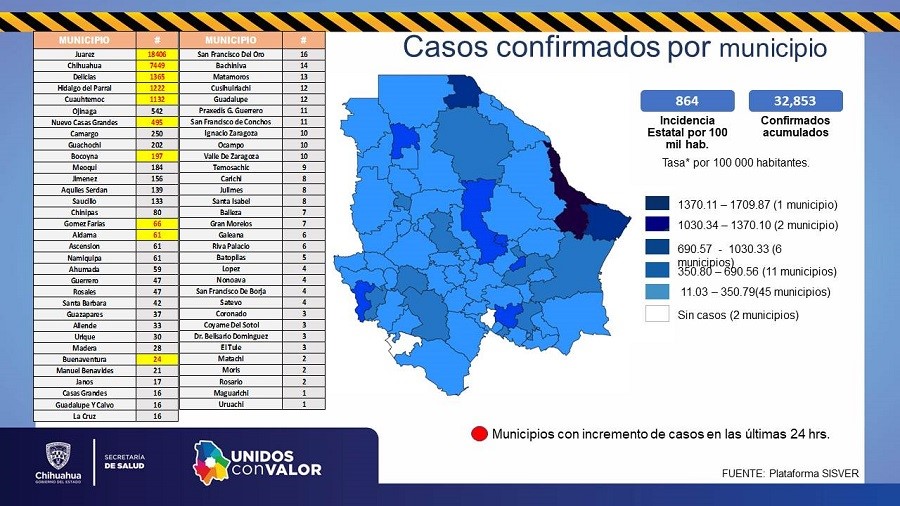 Casos por municipio: Ahumada 59, Aldama 61, Allende 33, Ascensión 61, Aquiles Serdán 139, Bachíniva 14, Batopilas 5, Bocoyna 197, Balleza 7, Buenaventura 24, Camargo 250, Carichí 8, Casas Grandes 16, Chihuahua 7 mil 449, Chínipas 80, Coronado 3, Coyame del Sotol 3, Cuauhtémoc 1,132, Cusihuiriachi 12, Delicias 1,365, Belisario Domínguez 3, Galeana 6, Gómez Farías 66, Guachochi 202, Gran Morelos 7, Guadalupe 12, Guadalupe y Calvo 16, Guazapares 37, Guerrero 47.