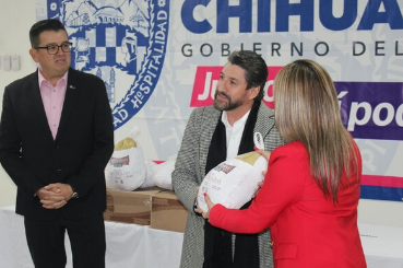 En conjunto con la directora de Grupos Vulnerables, Raquel Jiménez Rodríguez de la Secretaría de Desarrollo Humano y Bien Común, Gómez Gallegos recibió del presidente de INDEX, Román Rivas Hong y representantes del sector industrial, 352 pavos para la cena navideña en diferentes zonas de la entidad.
