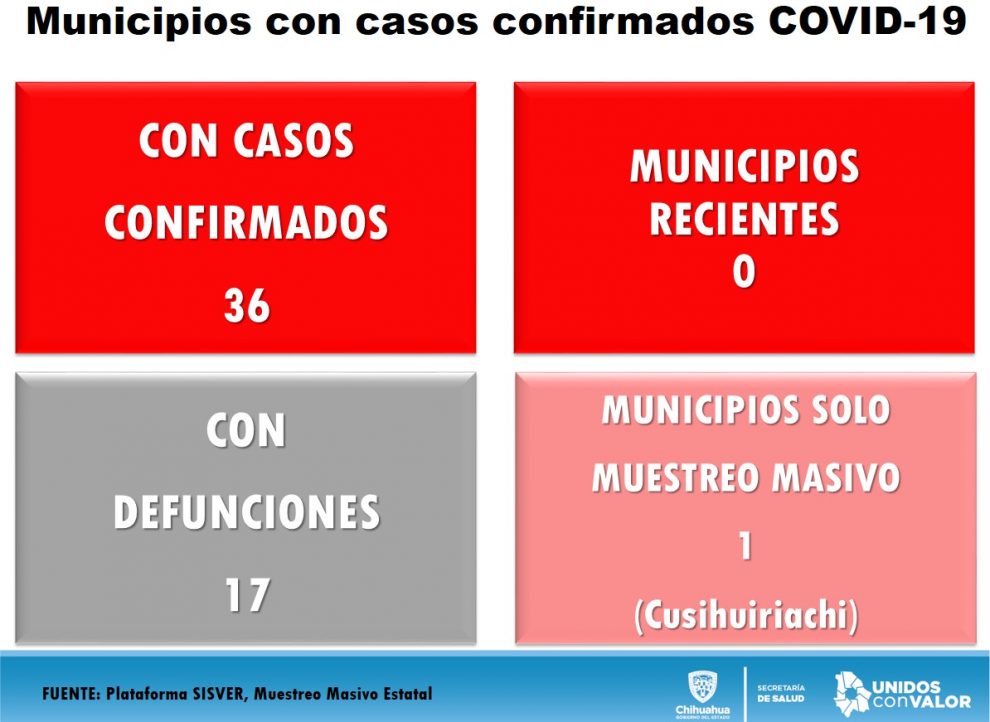 Los casos confirmados a las 19:00 horas del 3 de junio, son: 1,354 Juárez, 581 Chihuahua, 6 Bachíniva, 22 Cuauhtémoc, 11 Ojinaga, 3 Namiquipa, 30 Meoqui, 1 Julimes, 4 Camargo, 2 Saucillo, 4 Ahumada, 2 Guadalupe D.B., 12 Guachochi, 39 Delicias, 4 Ascensión, 1 Guerrero, 3 Bocoyna, 3 Madera, 69 Parral, 2 Buenaventura, 1 Temósachi, 1 Galeana, 3 Guadalupe y Calvo, 13 Nuevo Casas Grandes, 2 Rosales, 4 Jiménez, 2 Aldama, 1 Santa Bárbara, 2 Ignacio Zaragoza, 1 López, 4 Urique, 2 Janos, 1 San Francisco del Oro, 1 Guazapares, 1 Allende y 1 Coronado.
