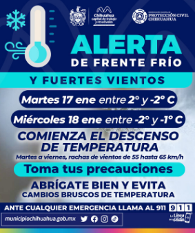 La Coordinación Municipal de Protección Civil, informa que para este próximo martes y miércoles se esperan fuertes rachas de vientos acompañados de un marcado descenso de temperaturas.