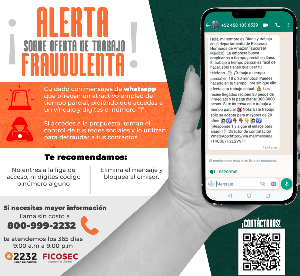 Si necesitas asesoría jurídica o acompañamiento en el proceso de denuncia, reiteramos los números de la Línea Ciudadana de FICOSEC *2232 o al 800 999 2232; así como su nueva forma de contacto por medio de un código QR en el que puede llenar un breve formato para ser atendido por un agente ciudadano.