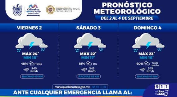 La Coordinación Municipal de Protección Civil a la población que este fin de semana se prevé que el pronóstico de lluvias, las cuales se espera que estén acompañadas de tormentas eléctricas y un ligero descenso en la temperatura de este fin de semana.