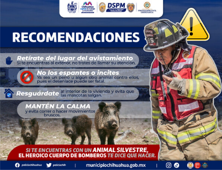 La Dirección de Seguridad Pública Municipal de Chihuahua, a través de la Subdirección de Bomberos y Rescate, recomienda a los senderistas, a quienes gustan de caminar y escalar en cerros aledaños a la ciudad, y a la ciudadanía en general, de extremar precauciones, debido al incremento de fauna silvestre en la temporada de calor, cuando suele hacerse más notoria su presencia.