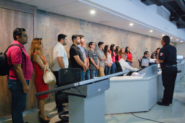 Los alumnos acudieron en compañía de los catedráticos Martha Torres y Kurt H. P. Kiessling Davidson durante el recorrido que comprendió el Centro de Operación y Monitoreo, el área de Emergencias 9-1-1, el Halcón 1 y los espacios para arrestos donde constataron la ubicación de cámaras de video para transmitir en tiempo real a la Comisión Estatal de Derechos Humanos el trato que se brinda a hombres, mujeres y menores detenidos.