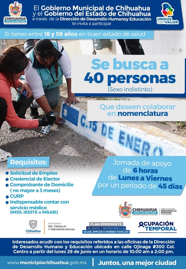 Si te viste afectado laboralmente por el confinamiento obligatorio a causa de la pandemia por el COVID-19, el Gobierno Municipal de Chihuahua informa a la ciudadanía que se iniciará con jornadas especiales de Ocupación Temporal, dentro de las cuales, se reclutará a ciudadanos que deseen colaborar en trabajos de nomenclatura en distintos sectores de la ciudad.