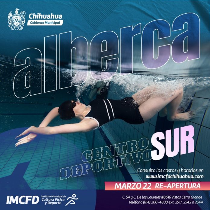 El Gobierno Municipal de Chihuahua, a través del Instituto Municipal de Cultura Física y Deporte, da a conocer que, a partir del martes 22 de marzo, se reanudan las clases de natación en la alberca del centro deportivo sur, que se ubica en Vistas Cerro Grande.