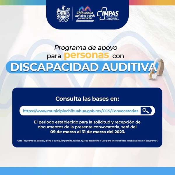 Al ser la salud uno de los temas primordiales para la presente administración encabezada por el alcalde Marco Bonilla, el Gobierno Municipal de Chihuahua, a través del Instituto Municipal de Prevención y Atención a la Salud (IMPAS), invita a la ciudadanía a participar en el programa “Apoyo para Personas con Discapacidad Auditiva”, en el cual se hará entrega de 65 aparatos auditivos.