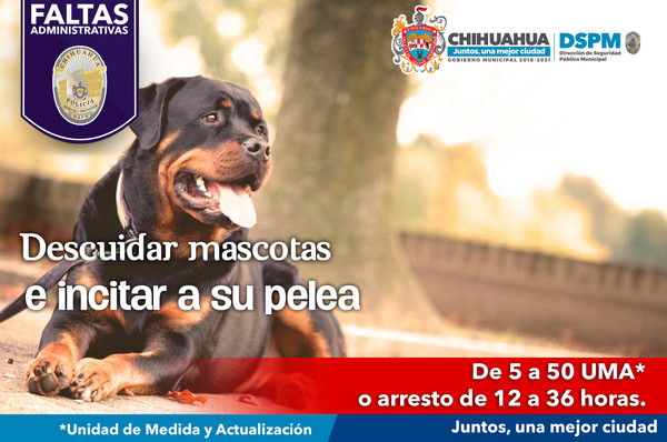 Asimismo dentro del Bando de Policía y Gobierno, se imponen sanciones económicas de 16 a 30 Unidades de Medida Actualizadas (UMA), de 19 a 24 horas cárcel, de 5 a 15 UMA o arresto de 12 a 18 horas, o de 31 a 50 UMA y de 25 a 36 horas en la Comandancia, para quienes según el grado de la falta incumplan con el cuidado de su mascota, o la utilicen para peleas o agredir a terceros.