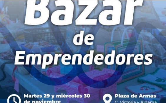 El Gobierno Municipal, a través de la Dirección de Desarrollo Humano y Educación en conjunto con la Universidad Autónoma de Chihuahua (UACH) y la asociación civil Red de Discapacidad, invita a toda la ciudadanía a asistir al “Bazar de Emprendedores” que tendrá lugar los días 13 y 14 de diciembre en la Plaza de Armas, desde las 11:00 a las 16:00 horas.