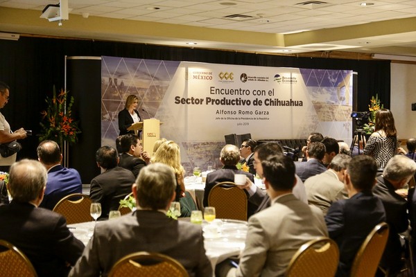 La presidenta municipal Maru Campos Galván asistió a la sesión de Desarrollo Económico del Estado de Chihuahua realizada en el Centro de Convenciones de la ciudad para la presentación de proyectos y programa del sector empresarial del estado a Alfonso Romo Garza, jefe de la Oficina de la Presidencia de la República.