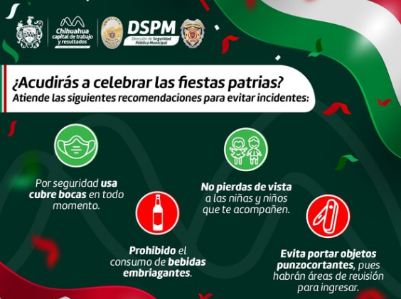 Para evitar percances durante la celebración de las fiestas patrias que organiza el Gobierno Estatal y durante el desfile por el Día de la Independencia, la Dirección de Seguridad Pública Municipal emite recomendaciones de autocuidado para celebrar en armonía y regresar con bien a casa.