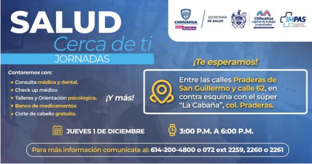 El Gobierno Municipal, a través del Instituto Municipal de Prevención y Atención a la Salud (IMPAS) brindará atenciones a la salud de manera gratuita para las y los residentes de la colonia Praderas del Sur, el jueves 1 de diciembre.