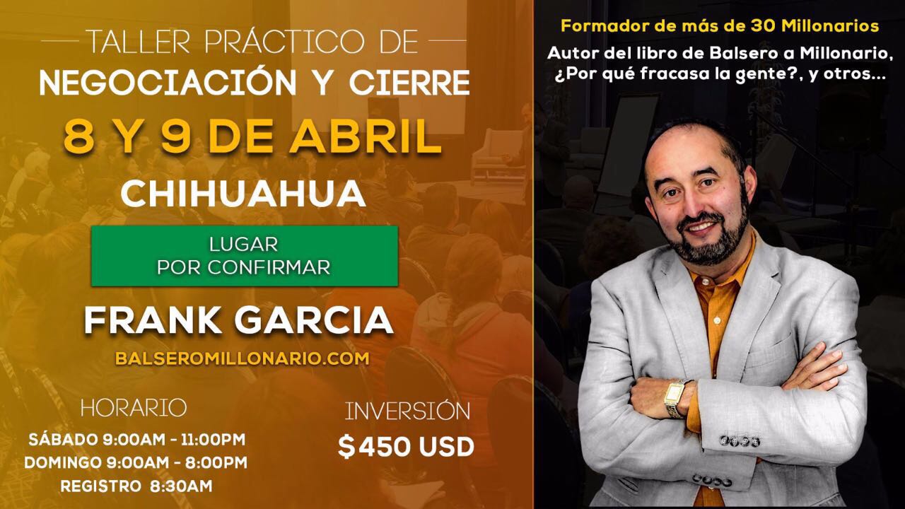 Se hace una atenta invitación al taller de negociación y cierre el 8 y 9 de abril con Frank Garcia, formador de más de 30 millonarios y autor de los libros De...