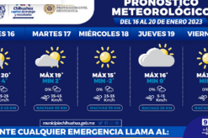 La Coordinación Municipal de Protección Civil, informa que de la semana del 16 al 20 de enero se esperan días fríos con rachas fuertes de viento para Chihuahua...
