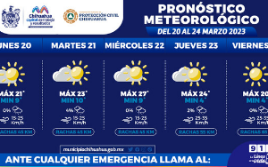 Chihuahua, Chih. A 20 de marzo de 2023.- La Coordinación Municipal de Protección Civil, informa que, para la semana del 20 al 24 de marzo, se esperan...