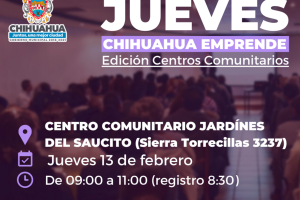 Dentro del Taller Jueves Chihuahua Emprende el próximo 13 de febrero en el Centro Comunitario Jardines del Saucito, al norte de la ciudad