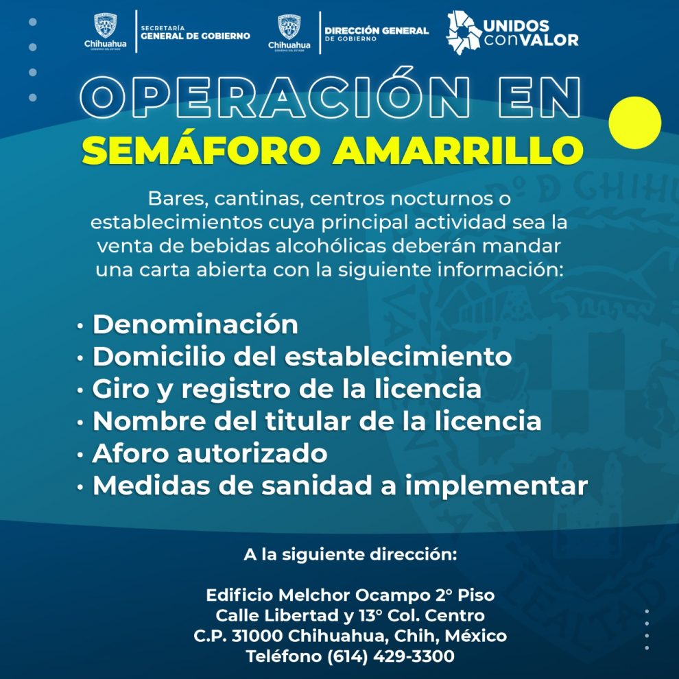 La Dirección General de Gobierno informa que con motivo del cambio del semáforo epidemiológico a color amarillo en la región Chihuahua, los establecimientos cuya actividad principal es la venta de bebidas alcohólicas en envase abierto, podrán reabrir sus puertas siempre y cuando cumplan con determinadas medidas.