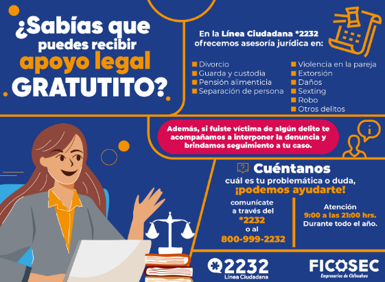 La Línea Ciudadana es un proyecto de FICOSEC que brinda asesoría y acompañamiento jurídico gratuito a víctimas del delito, facilitando la denuncia ante las autoridades correspondientes y ofreciendo seguimiento a la denuncia a fin de la persona afectada pueda recibir justicia.