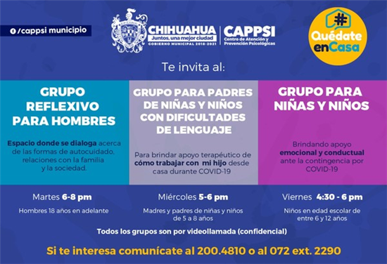 Cabe mencionar que, por instrucciones de la alcaldesa, Maru Campos Galván, se instaló el Call Center al servicio de los chihuahuenses desde el día 6 de abril, donde se da orientación médica y contención psicológica. Solo hay que marcar al teléfono 200 48 10 todos los días de la semana, de lunes a domingo, en un horario de 8 a.m. a 8 p.m.