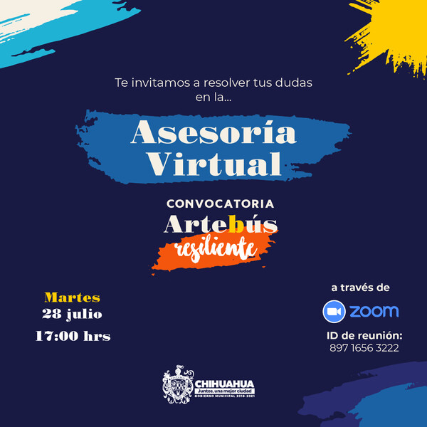 El Gobierno Municipal a través del Instituto de Cultura del Municipio de Chihuahua, te invita a la asesoría virtual, para resolver todas tus dudas y obtener más información acerca de la convocatoria “Artebús, Parabuses de Autor”, modalidad resiliente.