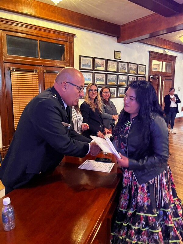 La ceremonia se llevó a cabo en días pasados en una ceremonia efectuada en el salón 12 de Octubre del edificio de Presidencia Municipal, presidida por el policía primero Jesús Fierro, Martha Moctezuma, subdirectora de Formación, Liliana Armendáriz, subdirectora de Prevención y Justicia Cívica, así como por María Concepción Zambrano, de la Coordinación Técnica de Zona 20, en representación de la institución educativa.
