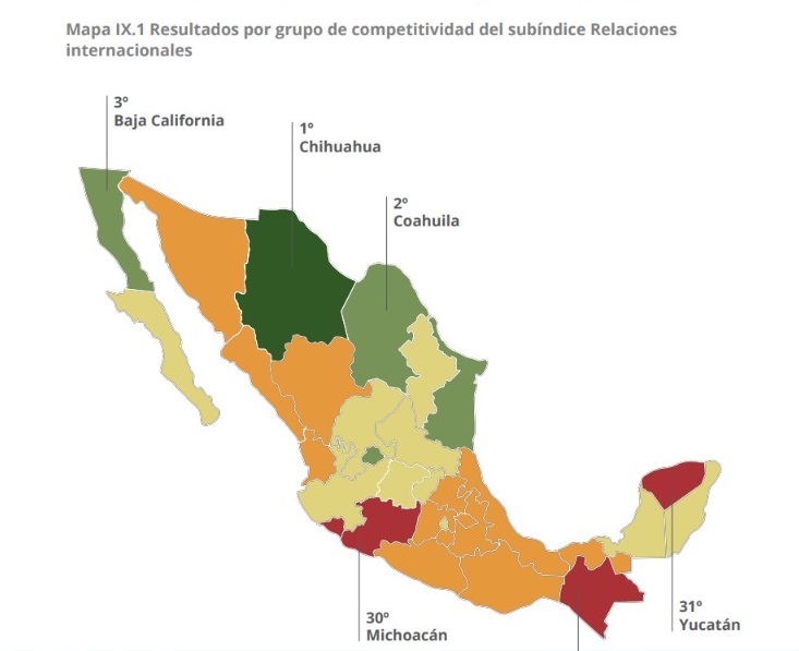Y Chihuahua, junto con otras cuatro entidades federativas, obtuvo una medalla de oro en “Aprovechamiento de las relaciones Internacionales”, de acuerdo con los parámetros del Índice de Competitividad Estatal del IMCO en los 10 rubros evaluados.