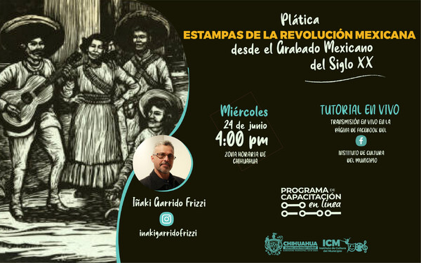 Con el fin de impulsar el conocimiento del arte del grabado mexicano, el Gobierno Municipal a través del Instituto de Cultura (ICM) realizará la plática “Estampas de la Revolución Mexicana desde el grabado mexicano” e invita a todos los interesados en participar a seguir la transmisión en vivo este miércoles 24 de junio en punto de las 4:00 pm horario de la ciudad de Chihuahua, en las redes del ICM.