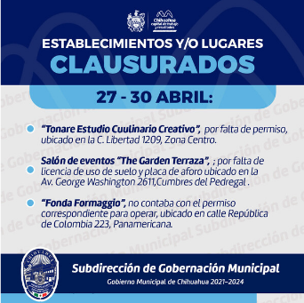 Chihuahua, Chih. A 01 de mayo de 2023.- El Gobierno Municipal, a través de la Subdirección de Gobernación, realizó el pasado fin de semana, 113 inspecciones a locales y establecimientos, donde clausuró tres y levantó ocho actas por diversos motivos, giradas del 27 al 30 de abril.
