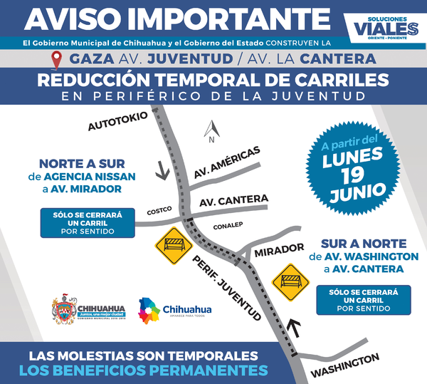 Este cierre es temporal e inicia este lunes 19 de junio para aprovechar el ciclo vacacional de los colegios y universidades durante el verano, tiempo en que disminuye el tráfico vehicular de la zona debido a que las familias aprovechan para salir de la ciudad de vacaciones o permanecer en casa para evitar el calor y disfrutar convivir en familia. Estos carriles volverán a abrirse para circulación normal al terminar de colocar el pilar central.