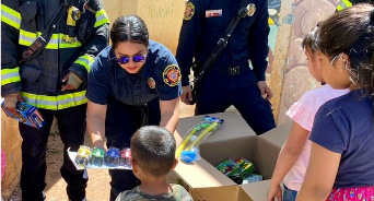Chihuahua, Chih. A 01 de mayo de 2023.- La Dirección de Seguridad Pública Municipal (DSPM) ofreció un festejo a hijas e hijos de empleados con motivo de Día de la Niñez, el cual contó con la visita de policías y bomberos del 22 al 30 de abril a diversos centros habitacionales ralámuli y la casa hogar Refugio del Amor con la entrega de dulces, alimentos y en algunos casos juguetes.