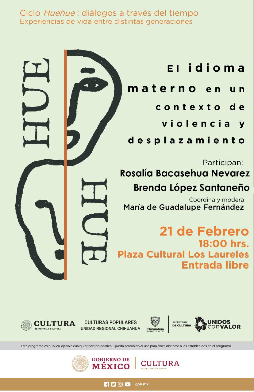 Conversatorio “Huehue: diálogos intergeneracionales”; y charla sobre trabajo del lingüista chihuahuense, este viernes 21 de febrero a las 6 de la tarde en la Plaza Cultural Los Laureles
