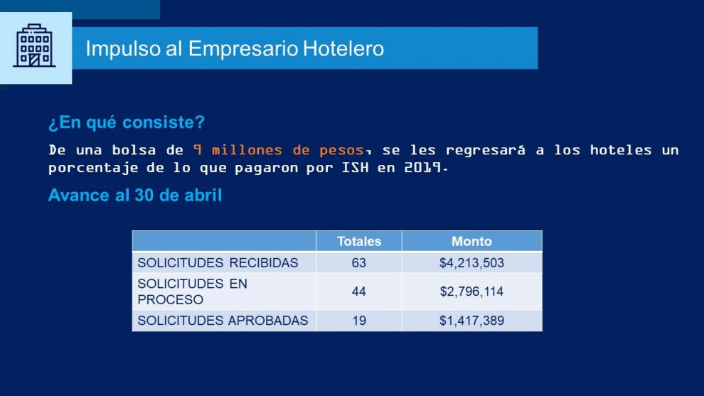 El segundo esquema de apoyo es el Impulso al Empresario Hotelero, en el cual, de una bolsa de 9 mdp, se les regresará un porcentaje de lo que pagaron por ISH en 2019. De este programa se tienen 63 solicitudes recibidas que implican un monto de 4 millones 213 mil 503 pesos; 44 están en proceso por una cantidad de 2 millones 796 mil 114 pesos y las restantes 19 son solicitudes aprobadas por un total de un millón 417 mil 389 pesos.