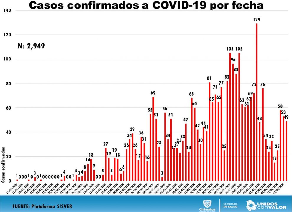 La Secretaría de Salud dio a conocer el informe correspondiente a las 19:00 horas del 14 de junio, el cual confirmó 49 casos más de contagios por COVID-19 (total 2,949) sin ninguna nueva defunción en el estado, por lo que se mantuvo el total de decesos en 478.