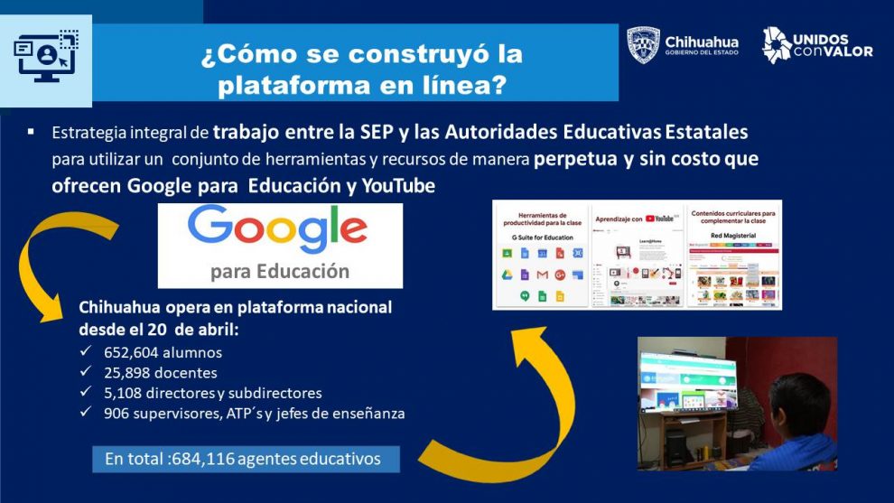 En el estado de Chihuahua, un total de 684 mil 116 agentes educativos utilizan la plataforma Google para Educación, para continuar las actividades escolares del ciclo 2019-2020.