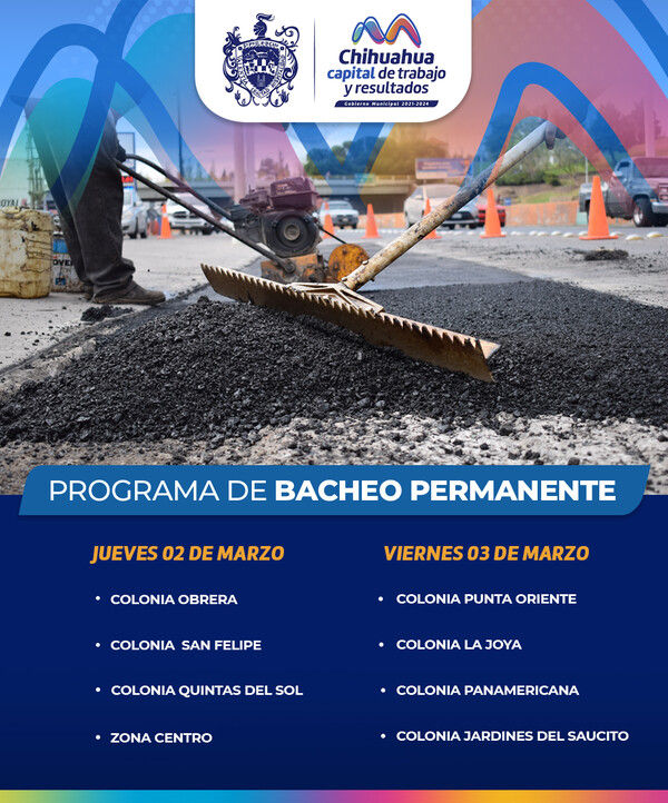Por indicaciones del alcalde Marco Bonilla, la Dirección de Obras Públicas del Gobierno Municipal de Chihuahua, exhorta a las y los conductores a tomar precauciones por los trabajos de bacheo que realizarán los días jueves 2 de marzo y viernes 3 de marzo en