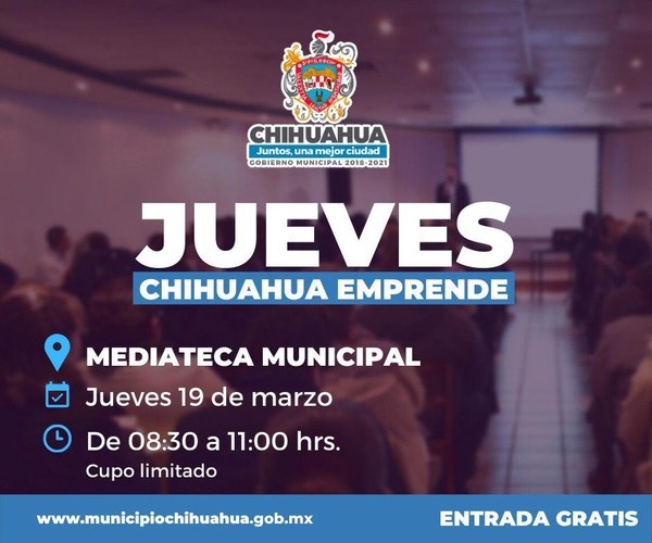 Como parte del compromiso del Gobierno Municipal por generar las condiciones adecuadas para la apertura de nuevos negocios, el próximo jueves 19 de marzo se llevará a cabo el taller gratuito Jueves Chihuahua Emprende. El evento será en la Mediateca Municipal, de 9:00 a 11:00 horas.