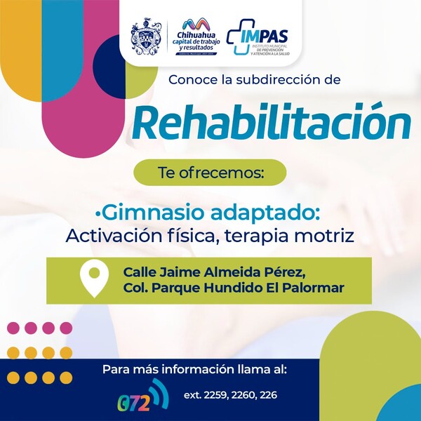 El Gobierno Municipal de Chihuahua, a través del Instituto Municipal de Prevención y Atención a la Salud (IMPAS), invita a las familias chihuahuenses a hacer uso de sus servicios de rehabilitación física.