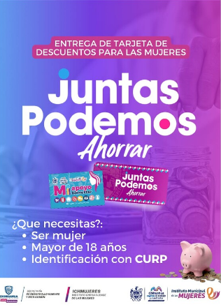 Chihuahua, Chih. A 01 de mayo de 2023.- El Gobierno Municipal que encabeza el alcalde Marco Bonilla, en alianza con Gobierno del Estado, ofrece el programa para mujeres “Juntas Podemos Ahorrar”, el cual otorga una tarjeta de descuentos, con la cual podrás recibir beneficios especiales en los negocios registrados.