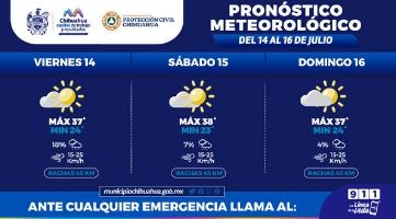 Chihuahua, Chih. A 14 de julio de 2023.- La Coordinación Municipal de Protección Civil, informa que este fin de semana, del 14 de julio al 16 de julio, se prevén temperaturas máximas de 38°C y con mínimas de hasta 23°C, por lo cual se exhorta a la población a atender las recomendaciones por calor para evitar complicaciones en la salud.