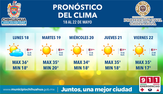 mencionada dependencia municipal, el lunes será el día más caluroso y la temperatura llegará hasta los 36 grados centígrados como máxima y a los 18 como mínima, mientras que para el martes rondarán los 35 y 20 grados, respectivamente.
