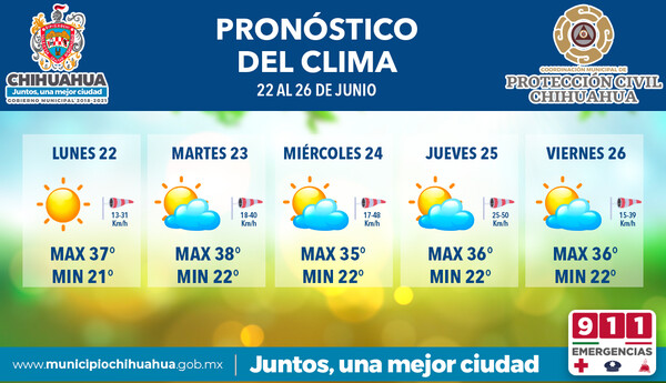 Joel Estrada Castillo, titular de la dependencia municipal, recomendó a los chihuahuenses continuar tomando las debidas precauciones para prevenir deshidrataciones y problemas de salud e instó a los ciudadanos a permanecer en casa en la medida de lo posible, pues a pesar de que la ciudad se encuentra en semáforo sanitario naranja por COVID-19, las medidas preventivas deberán continuar, guardando la sana distancia, utilizando cubre bocas y evitando aglomeraciones.