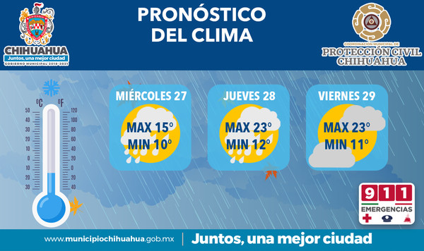 La Coordinación de Protección Civil Municipal informa que, según el pronóstico del clima a nivel nacional, continuarán las lluvias hasta el jueves y habrá un ligero descenso en la temperatura, por ello exhorta a los chihuahuenses a seguir recomendaciones básicas que ayudarán a evitar incidentes en el hogar, en la vía pública y problemas de salud.