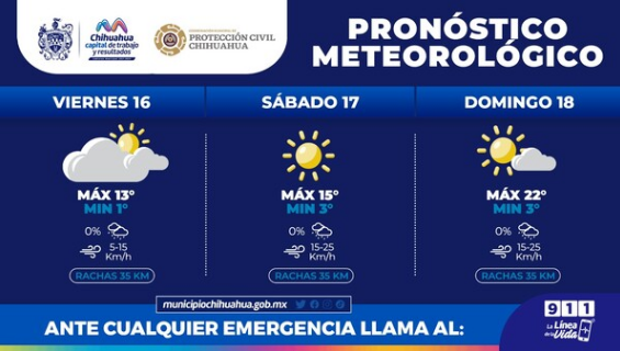 De acuerdo al pronóstico que emite el Servicio Meteorológico Nacional de CONAGUA, para este viernes se espera una temperatura máxima de 13°C y una mínima de 1°C con vientos de hasta 35 kilómetros por hora con un