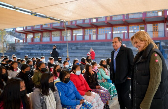 En el marco de la gira de trabajo que realizó por el poblado de Sisoguichi, municipio de Bocoyna, la gobernadora Maru Campos convivió con los estudiantes y el personal del Instituto Técnico de la localidad, además de recorrer las instalaciones del plantel y de la catedral.