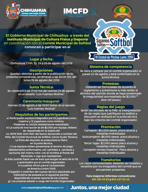 A partir de la presente publicación, podrán comenzar a inscribirse los equipos interesados en participar en el próximo Torneo ‘Sigamos juntos en el Softbol’ en la modalidad de pitcheo lento que organiza el Gobierno Municipal de Chihuahua a través del Instituto Municipal de Cultura Física y Deporte, el cuál dará inicio del 23 al 25 de agosto en el estadio “Luis Fuentes Molinar”.