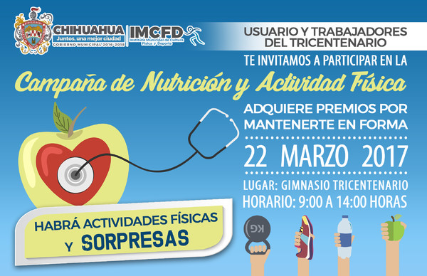 Para incentivar a los usuarios del Centro Deportivo Tricentenario y a los empleados del Instituto Municipal de Cultura Física y Deporte en la activación física, el miércoles 22 de marzo en un horario de 8:00 a 14:00 horas se llevará a cabo la Campaña de Nutrición y Actividad Física.