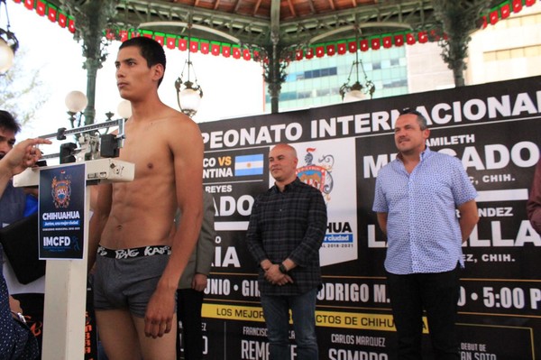 Frente a un importante público chihuahuense y aficionados reunidos en Plaza de Armas, pasaron uno a uno los boxeadores arriba de la báscula y con la